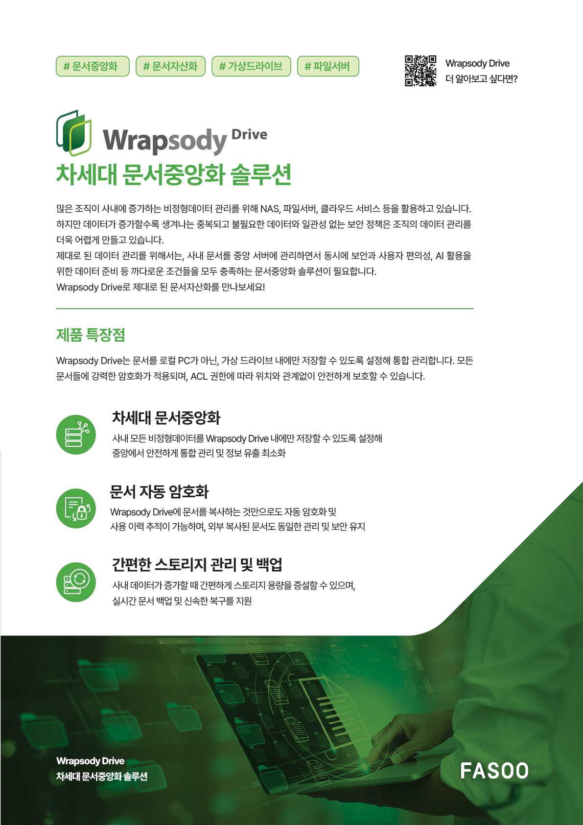 규모와 관계 없이 조직의 정보 관리 체계와 비정형데이터 보안 수준을 효율적으로 향상 시킬 수 있는 첫 번째 열쇠, 차세대 문서중앙화 Wrapsody Drive가 여러분을 찾아갑니다!